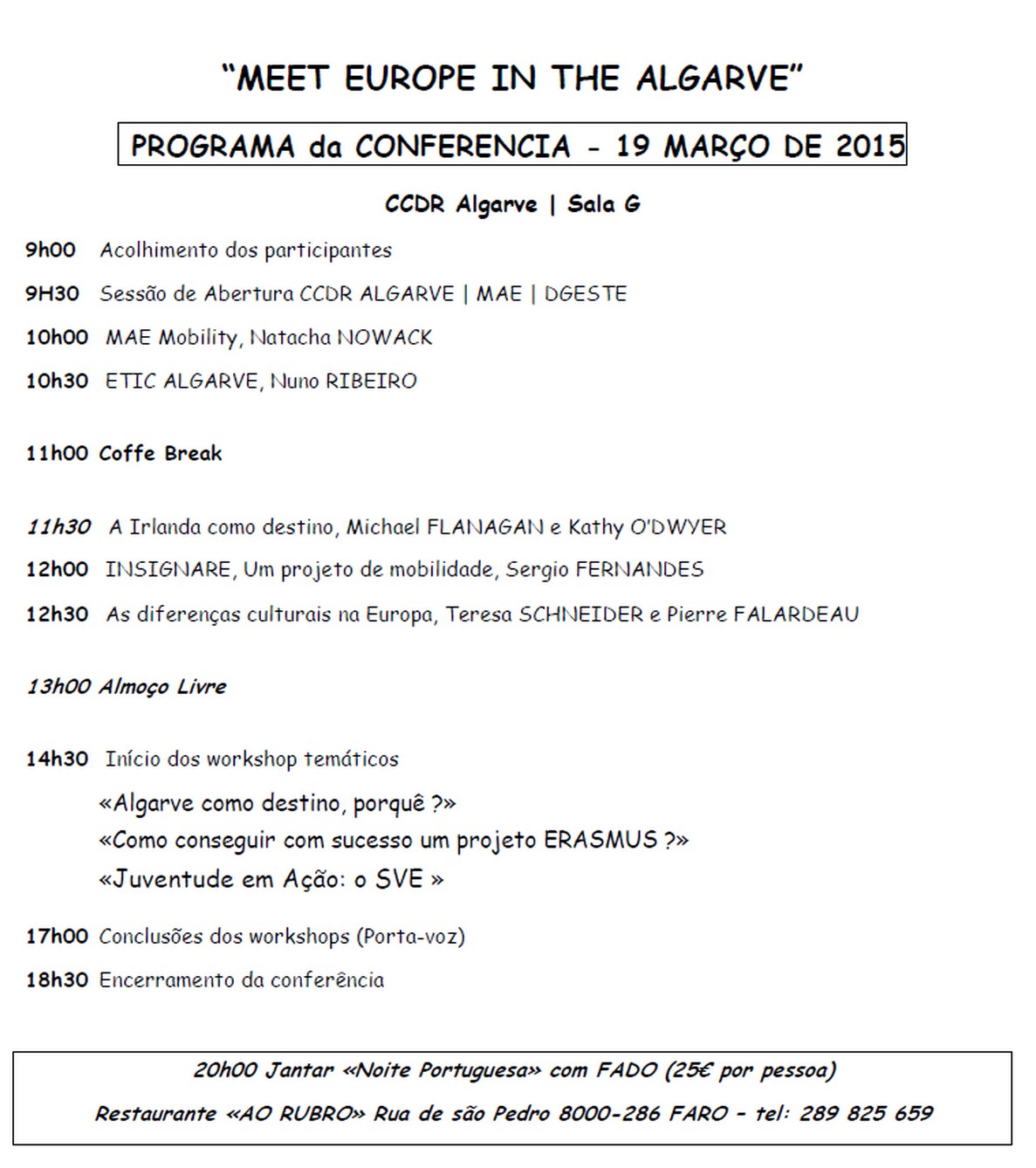 Para informação mais detalhada queira consultar o programa anexo. O idioma/língua de trabalho será o Inglês. Estamos ansiosos por lhe proporcionar o encontro com a Europa!