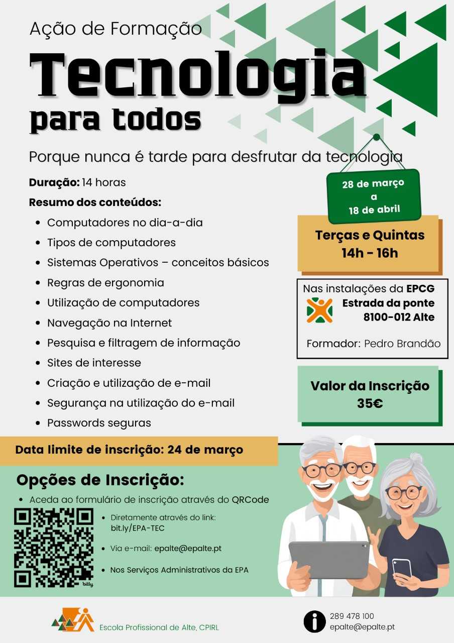 A ação de formação “Tecnologia para Todos”, que tem como destinatários o público em geral com dificuldades ou limitações na área das tecnologias, abordará diversos conceitos básicos, desde os computadores que utilizamos no dia a dia, sistemas operativos e os principais programas, navegação na internet, utilização do e-mail e redes sociais passando por regras de ergonomia e de segurança.