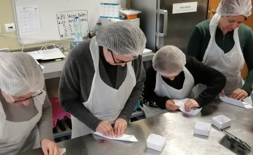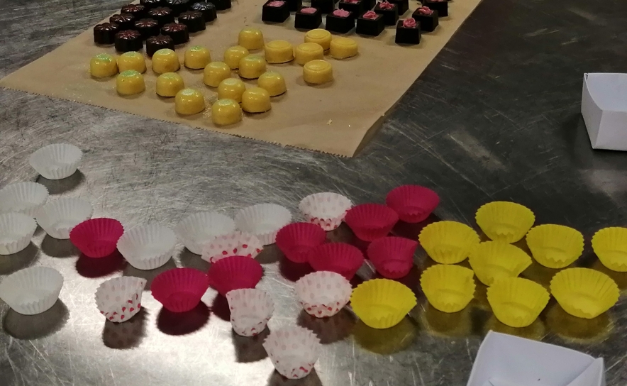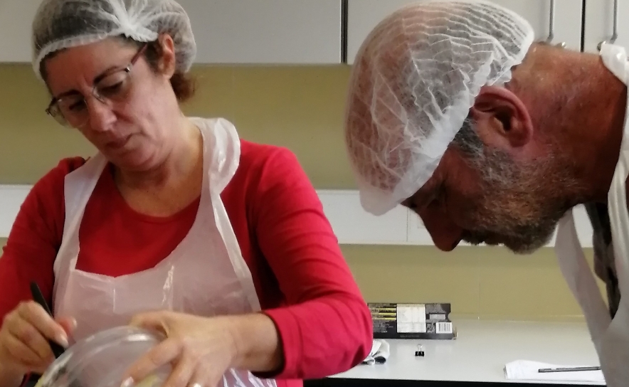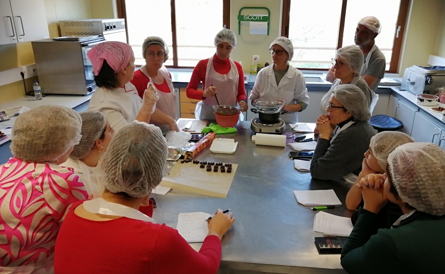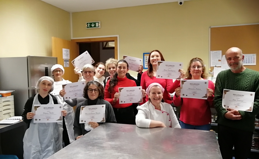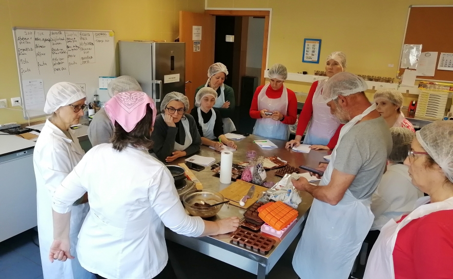 Durante 4 horas, no Laboratório de Processamento e Controlo de Qualidade Alimentar da Escola Profissional Cândido Guerreiro, escola propriedade daquela Cooperativa, e sob a orientação da formadora Dora Barradas, fez-se a abordagem teórica e prática da confeção de Bombons de Chocolate Negro, de Leite e de Manteiga de Cacau, vulgarmente designada por chocolate branco.