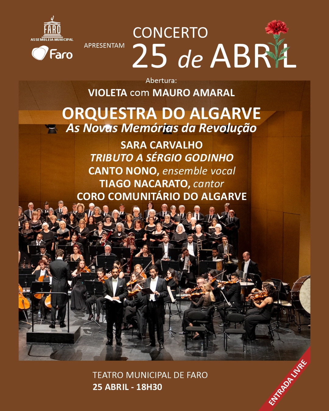 O espetáculo propõe um percurso musical em torno da luta, do despertar e do triunfo da liberdade, cruzando repertório clássico e criação contemporânea. Destaque para a estreia mundial da obra “Emergimos da noite e do silêncio”, da compositora Sara Carvalho, uma criação que evoca a energia coletiva da revolução e integra o público como parte ativa da experiência sonora. O concerto prossegue com um Tributo a Sérgio Godinho, figura maior da música portuguesa e da canção de intervenção. Juntam-se em palco a Orquestra do Algarve, o ensemble vocal Canto Nono, o cantor Tiago Nacarato e o Coro Comunitário da Associação Musical do Algarve.