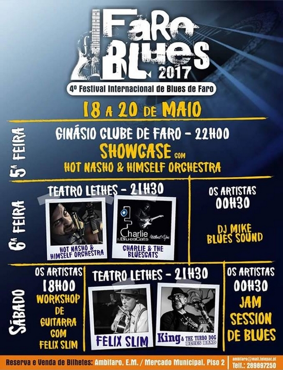 O festival começa logo no dia 18, com um Show Case de apresentação do terceiro trabalho do músico espanhol Nasho Hotblues & Himself Orchestra no Ginásio Clube de Faro às 22h00. No dia 19 sobem ao palco do Teatro Lethes a partir das 21h30, Nasho Hotblues, recuperando temas dos seus trabalhos anteriores, seguindo-se a mítica banda “Charlie and the bluescats”. A noite termina na Sociedade Recreativa Artística Farense “Os Artistas” que vai contar com a presença do britânico DJ Mike, um dj especializado nos Blues. No dia 20 de Maio, haverá um workshop com Felix Slim guitarrista espanhol, n´os Artistas pelas 18h00. À noite, os concertos continuam no Teatro Lethes com Julio King and the Turbodog Blues Band e Felix Slim, musico finalista dos European Blues Awards de 2017, seguidos de uma jam-session de blues, mais uma vez n´os Artistas.