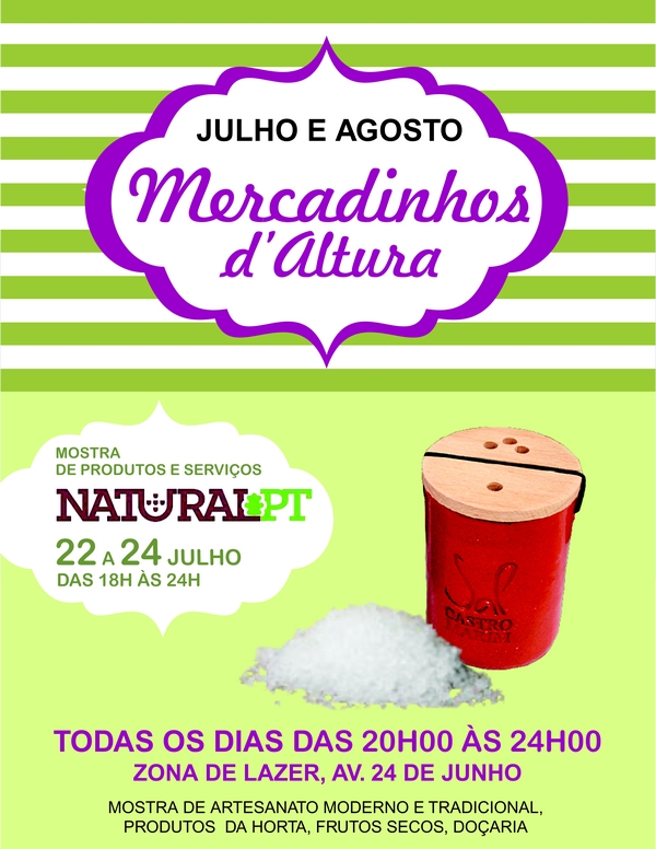 A “Feira Natural.PT” é uma aposta na biodiversidade, na economia, no património e identidade da região e, ao mesmo tempo, enriquece o programa de animação de verão em Altura. Esta iniciativa é promovida pelo Município de Castro Marim em parceria com o Instituto de Conservação da Natureza (ICN) e enquadra-se no programa de educação ambiental da Bandeira Azul 2016.