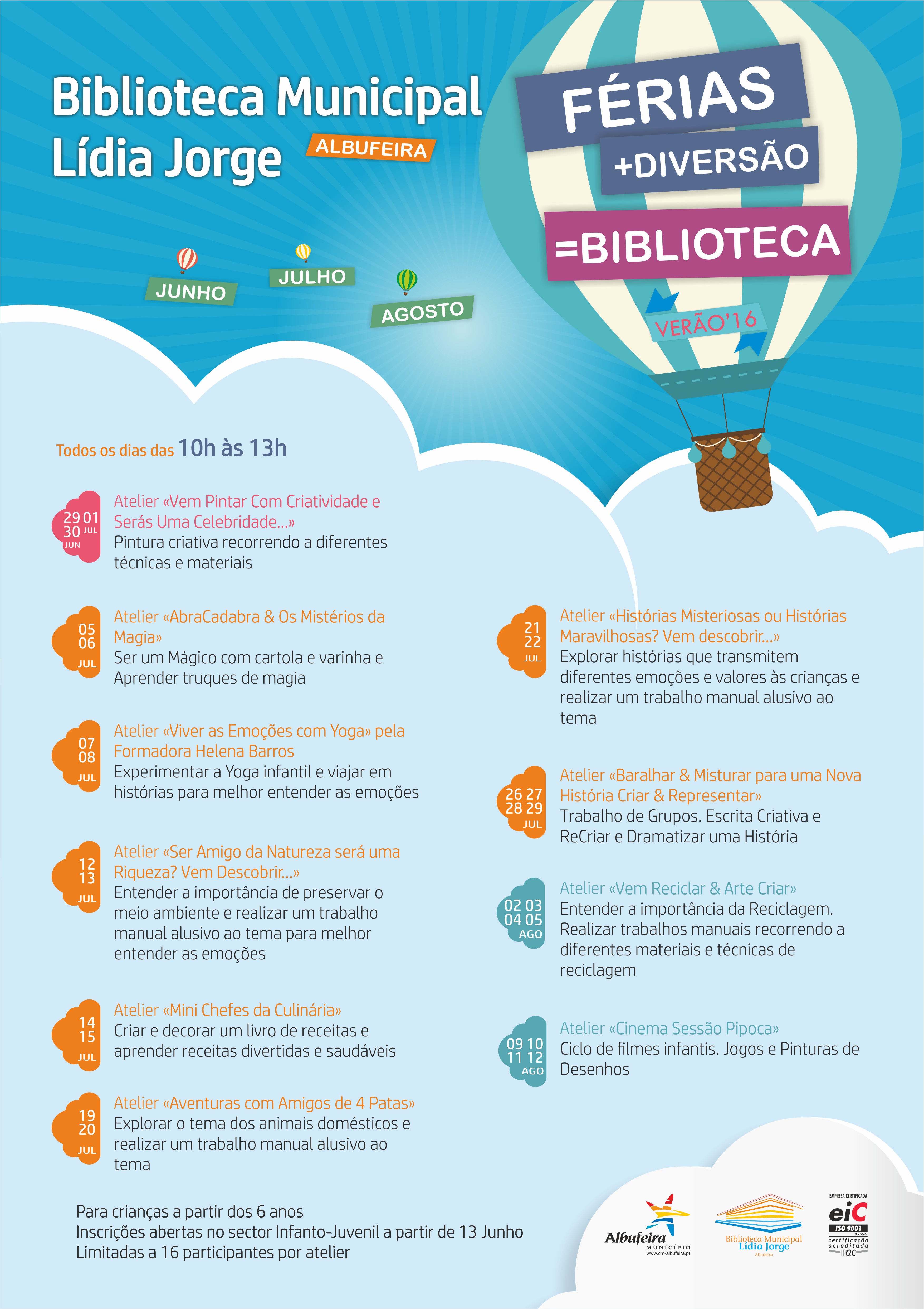 Aqui o programa está vocacionado para os mais pequeninos: crianças a partir dos 6 anos. As atividades começam já este mês e prolongam-se por julho e agosto. As inscrições decorrem no setor Infanto-Juvenil da Biblioteca, a partir de hoje (13 de junho) e são limitadas a 16 participantes por atelier.