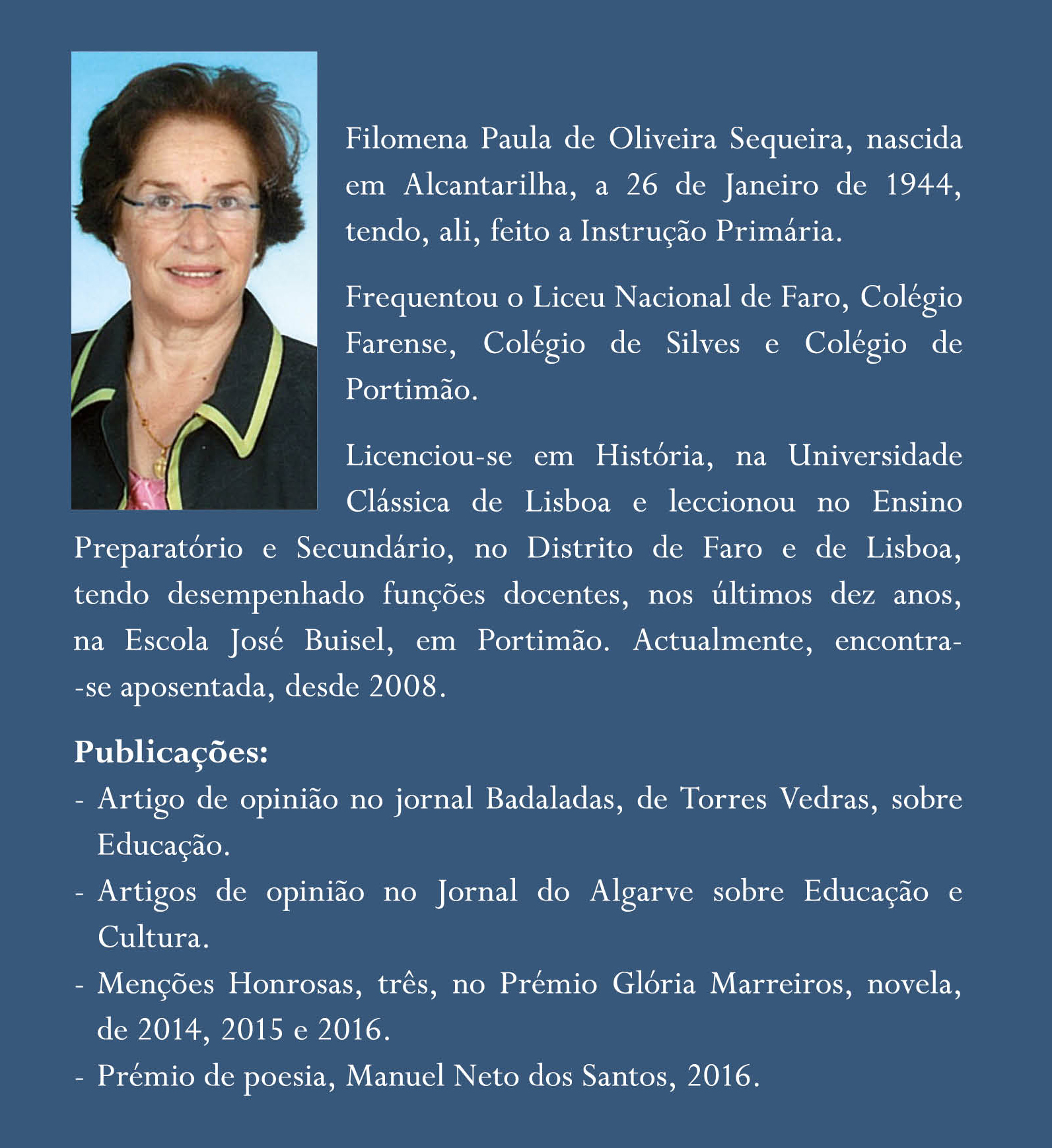 Licenciada em História, Filomena Sequeira foi professora do Ensino Preparatório e Secundário em escolas dos distritos de Faro e de Lisboa. Além de um livro de Poesia editado, a autora publicou na imprensa diversos artigos de opinião sobre Educação e Cultura.