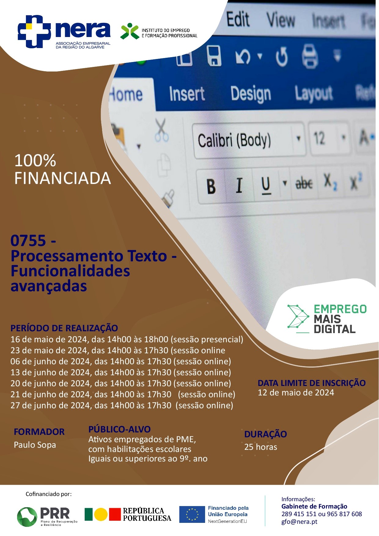 No âmbito do Projeto EMPREGO + DIGITAL, o NERA realizará em formato misto (1 sessão presencial e restantes sessões online) a seguinte Ação de Formação Modular Certificada: