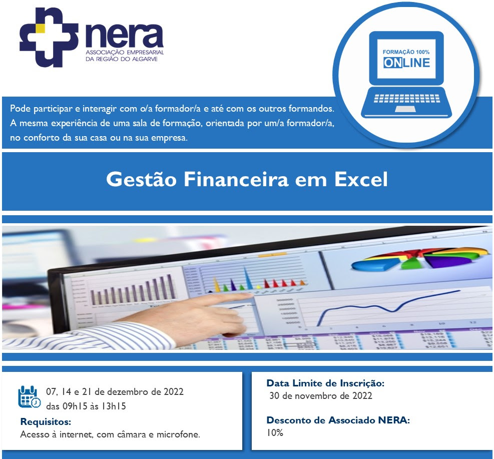 Com o objetivo de habilitar os formandos a dominar Excel, de modo a analisar, calcular, gerir e apresentar dados, o NERA irá realizar, nos dias 07, 14 e 21 de dezembro de 2022, entre as 9h15 às 13h15, a ação de formação: Gestão Financeira em Excel.
