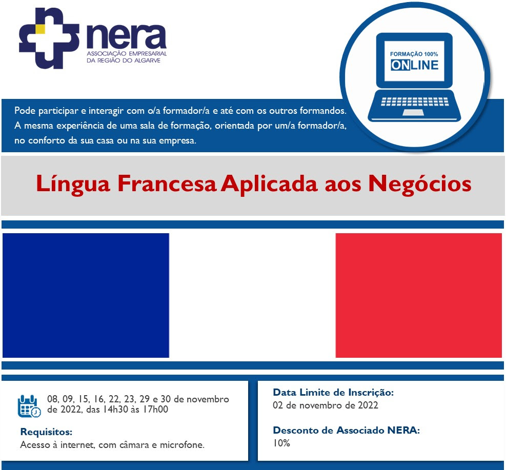 Com o objetivo de dotar os formandos com um vasto leque de conhecimentos linguísticos que lhes permitam desenvolver competências da língua francesa aplicada à realidade empresarial, o NERA irá realizar, em formato online, nos dias 08, 09, 15, 16, 22, 23, 29 e 30 de novembro de 2022, entre as 14h30 e as 17h00, a ação de formação: Língua Francesa Aplicada aos Negócios.