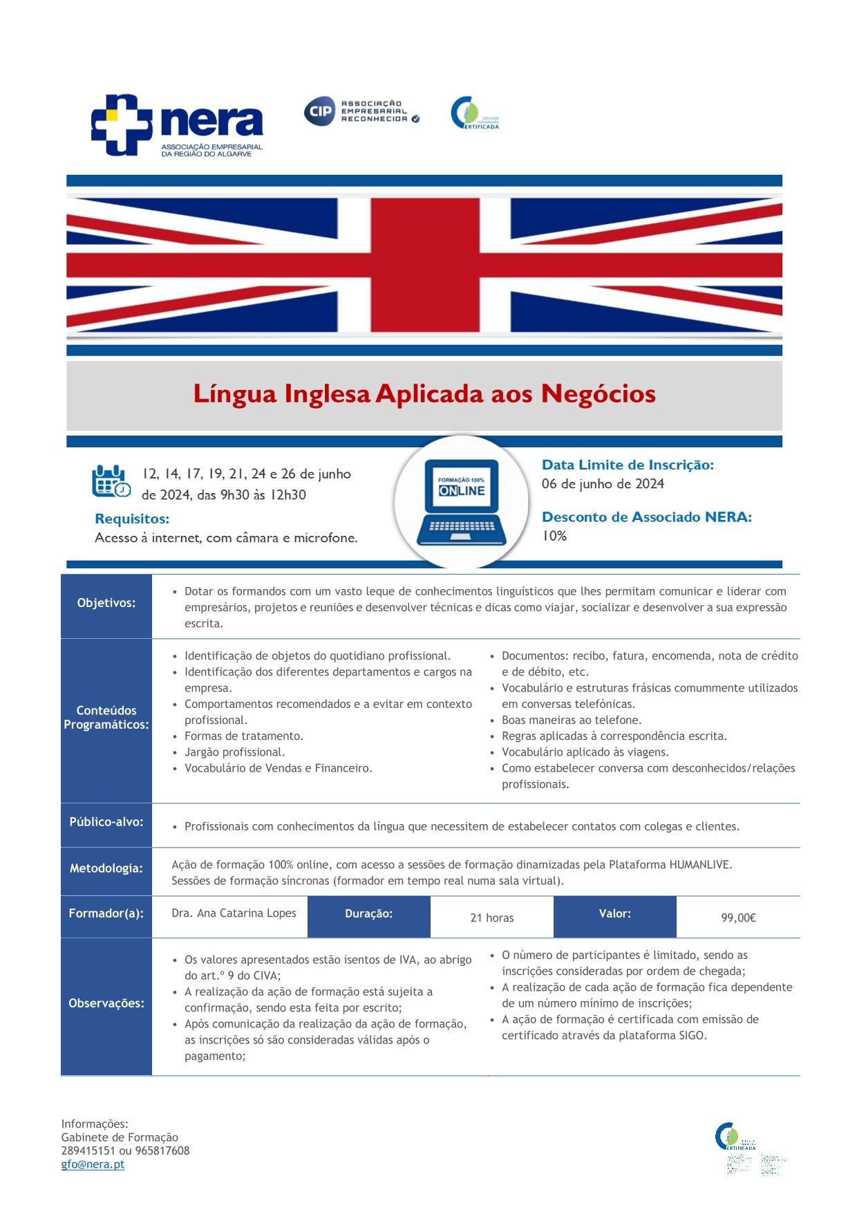 Com o objetivo de dotar os formandos com um vasto leque de conhecimentos linguísticos que lhes permitam comunicar e liderar com empresários, projetos e reuniões e desenvolver técnicas e dicas como viajar, socializar e desenvolver a sua expressão escrita, o NERA irá realizar, nos dias 12, 14, 17, 19, 21, 24 e 26 de junho de 2024, das 9h30 às 12h30.