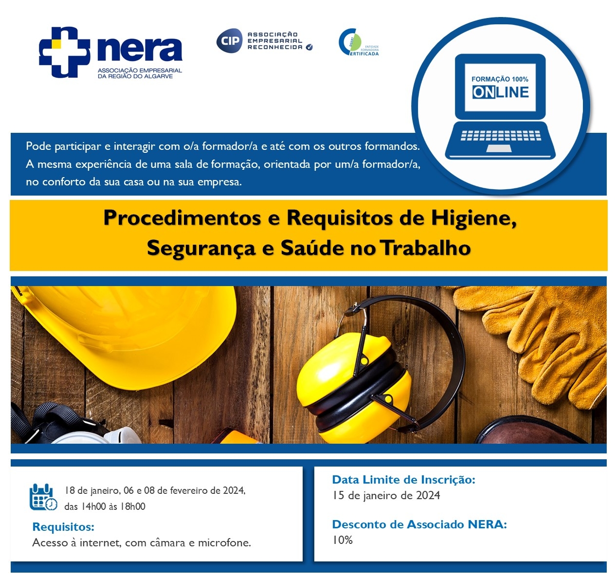 Com o objetivo de promover a formação aos trabalhadores e demais intervenientes nos locais de trabalho, possibilitando a aquisição de competências ao nível da identificação e prevenção dos riscos profissionais, o NERA irá realizar, nos dias 18 de janeiro, 06 e 08 de fevereiro de 2024, das 14h00 às 18h00, a ação de formação: Procedimentos e Requisitos de Higiene, Segurança e Saúde no Trabalho.