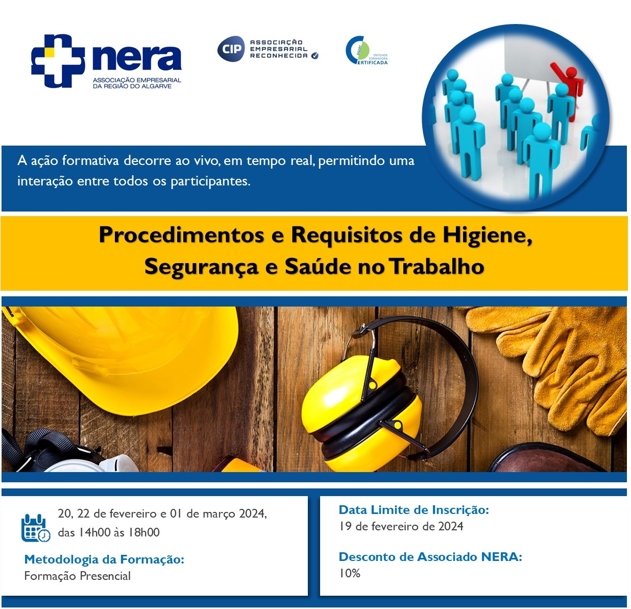 Com o objetivo de promover a formação aos trabalhadores e demais intervenientes nos locais de trabalho, possibilitando a aquisição de competências ao nível da identificação e prevenção dos riscos profissionais, o NERA irá realizar, nos dias 20, 22 de fevereiro e 01 de março 2024, das 14h00 às 18h00, a ação de formação: Procedimentos e Requisitos de Higiene, Segurança e Saúde no Trabalho.
