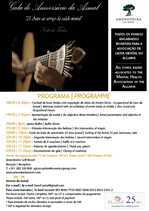 O presente evento integra-se nas comemorações dos 25 anos de trabalho da associação em prol da saúde mental, na região do Algarve e a nível nacional, e visa angariar fundos para a aquisição de uma viatura de nove lugares. Sublinha-se ainda que esta ação se enquadra nos eventos de Comemoração do Dia Mundial da Saúde Mental (10/10).