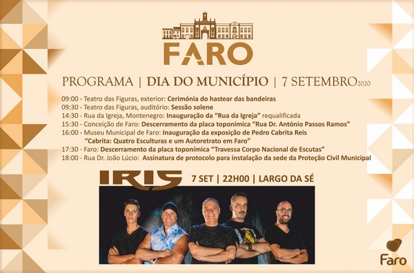 O último ponto alto deste feriado municipal, que marcará o encerramento das comemorações, será o concerto com a banda “Íris”, no Largo da Sé, pelas 22:00. A entrada, para maiores de 6 anos, é gratuita (máximo de 2 bilhetes por pessoa), mediante a entrega de um bem alimentar a favor da União Audiovisual, grupo informal de profissionais do ramo do audiovisual que se reuniu no início da crise social causada pelo COVID-19. Os ingressos podem ser adquiridos na bilheteira do Teatro das Figuras (horário habitual), no edifício da Câmara Municipal de Faro, dias 3, 4, 5 e 6 de setembro, das 18h30 às 22h00 e no próprio dia, no local do espectáculo, a partir das 15h00. A lotação do recinto estará limitada e o espetáculo cumprirá as normas de distanciamento e segurança sanitária da DGS. O uso de máscara é obrigatório em todos os momentos do Dia do Município.