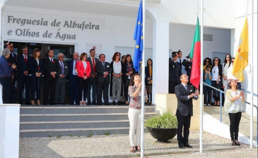 Num ambiente de manifesta alegria, a Freguesia de Ferreira assistiu à Guarda de Honra e hastear da Bandeira Nacional ao som do Hino naquela que é a nova sede administrativa da Junta de Freguesia. Antes, as freguesias de Albufeira e Olhos d’Água, Guia e Paderne, foram alvo das mesmas honras alusivas à efeméride, como tem sido tradição ao longo destes últimos 43 anos, frente às sedes de Juntas de Freguesia. Em Ferreiras, o novo espaço para a Junta e Assembleia de Freguesia vem colmatar a situação de exiguidade que a Junta de Freguesia até então vivia, num espaço arrendado. A nova sede foi uma aquisição do Município de Albufeira que após as devidas obras somou um investimento no total de 250 mil euros. Este foi o ponto alto das Comemorações do 25 de Abril no Município, o qual contou também com a assinatura pública do contrato de comodato por um período de 20 anos renováveis. O espaço vai também, em breve, abrir as portas a cinco agregados familiares por ter 5 habitações acopladas.