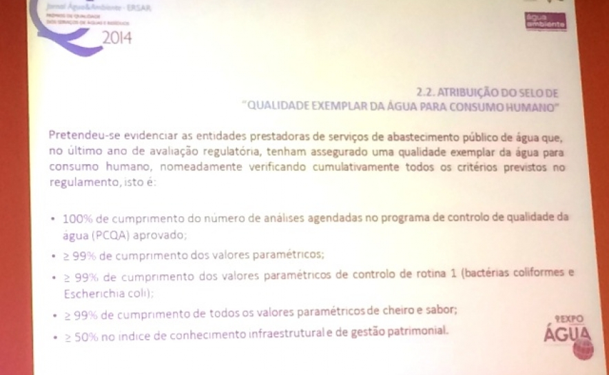 A empresa municipal de infraestruturas da Quinta do Lago recebeu o Selo de Qualidade exemplar da água para consumo humano 2014 numa cerimónia integrada na 9.ª Expo Conferência da Água, que decorreu no Centro de Congressos do LNEC, em Lisboa.