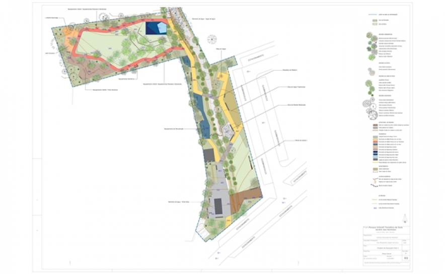 Será recuperada a linha de água existente, um canteiro de plantas aromáticas e criadas áreas de estadia informais com mobiliário associado, anfiteatro em relva, percursos de circulação interna.