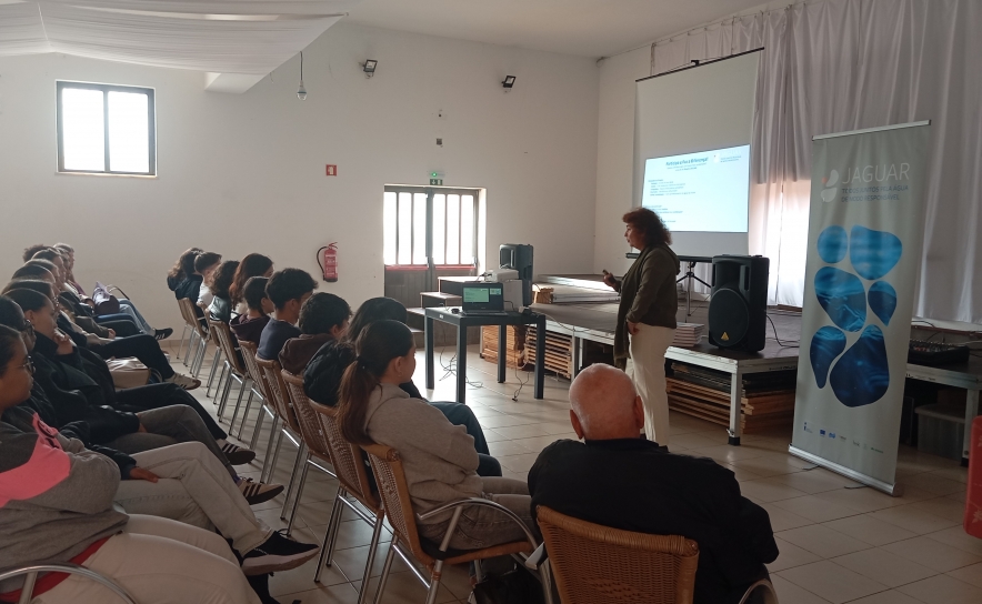 Ao longo da manhã, foi apresentado o projeto JAGUAR, bem como o conjunto de atividades previstas, seguindo-se uma abordagem dedicada ao uso sustentável da água e à partilha de boas práticas. Um dos pontos altos foi a explicação sobre o Cálculo da Pegada Hídrica (https://ech2o.aprh.pt/peghidrica/pt/), que permitiu aos participantes refletir sobre o impacto das suas escolhas diárias no consumo dos recursos hídricos. A iniciativa terminou com a distribuição de kits de sensibilização, incentivando a adoção de comportamentos mais responsáveis no dia a dia.