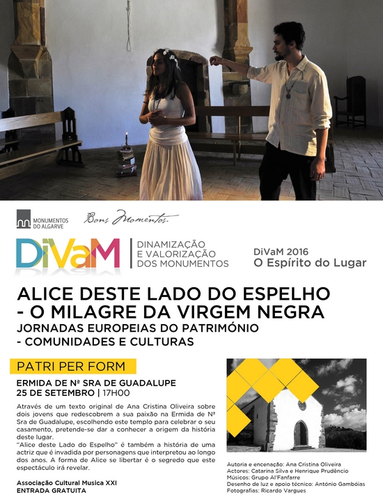 Jornadas Europeias do Património (JEP), este ano com o tema “Comunidades e Culturas”, estarão na Ermida de Nª Sra de Guadalupe, dia 25 de setembro, pelas 17 horas, com “Alice deste lado do espelho - O Milagre da Virgem Negra “, uma produção da Associação Cultural Música XXI.