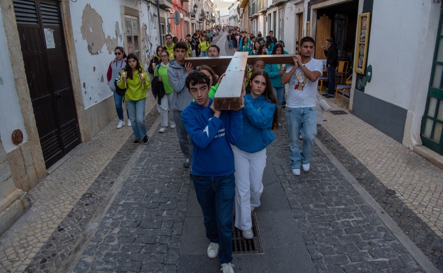 Seguiu-se o momento de adoração eucarística – durante o qual leram também as cartas que tinham escrito no caminho de preparação para o seu Jubileu em Roma com as expectativas que tinham para o presente Ano Santo – e a procissão com o Santíssimo Sacramento pela baixa da cidade até à catedral, presidida também pelo padre Samuel Camacho. Ali chegados, os jovens foram recebidos pelo bispo do Algarve no cimo da escadaria onde foi também colocada a cruz das JDJ que também veio no cortejo. “Viestes com Cristo, percorrendo as ruas desta cidade. Fostes rezando e meditando na vossa vida; como encontrar a verdadeira alegria, paz e esperança quando decidis seguir a Cristo, luz do mundo, como peregrinos nesta terra”, disse-lhes D. Manuel Quintas, convidando-os a renovar as promessas do seu Batismo antes de entrarem na Sé para celebrarem a Eucaristia.