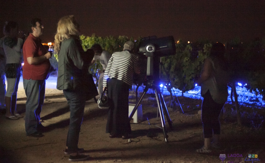 Em plena vinha, os participantes tiveram a oportunidade de provar os preciosos néctares desta Quinta, provenientes das melhores castas (Aragonês, Touriga Nacional, Syrah e Cabernet Sauvignon) e em simultâneo observar as constelações caraterísticas da época, nomeadamente as de Sagitário e Escorpião, devidamente apresentadas pelos monitores do Centro de Ciência Viva.