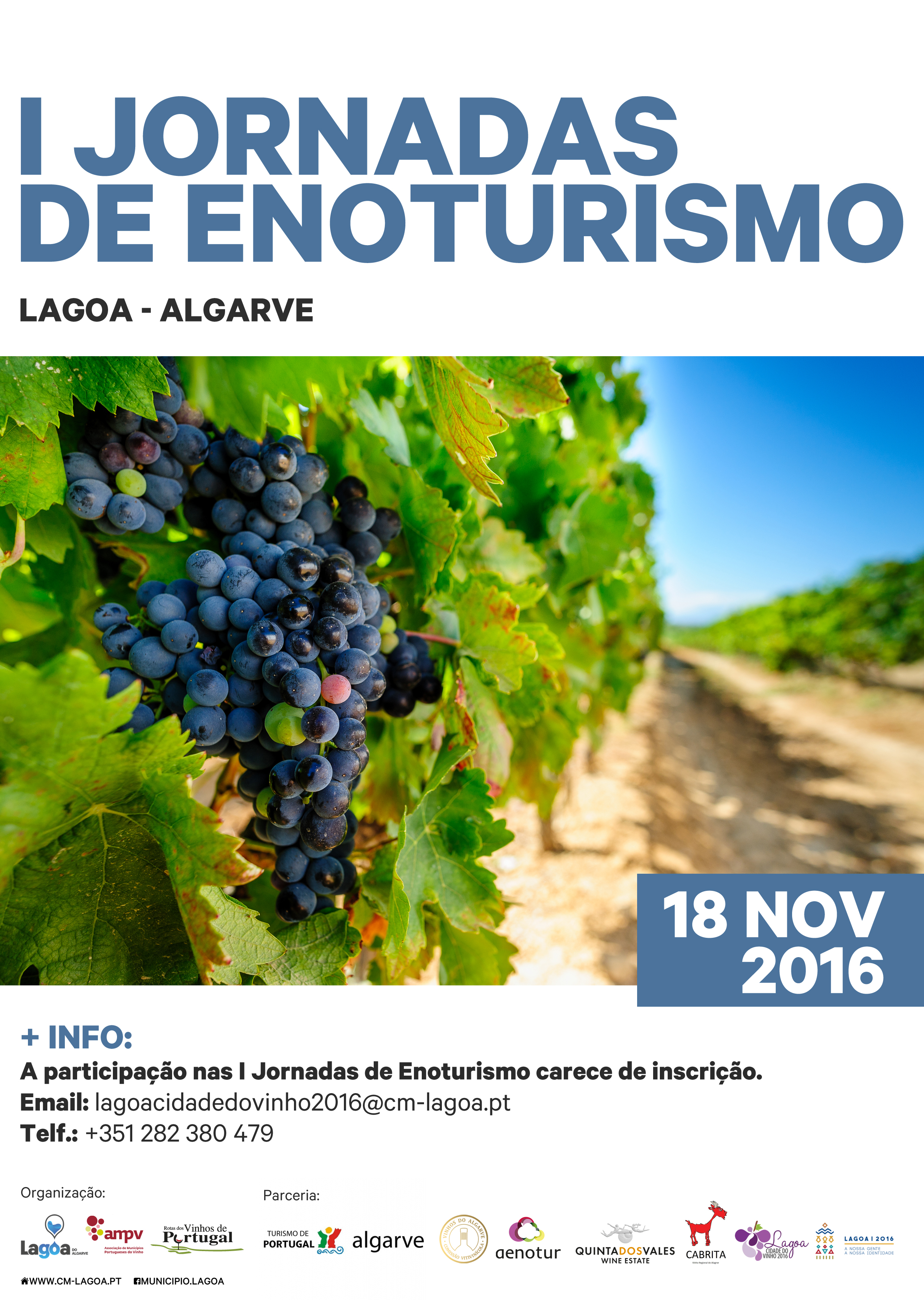 Nos dias 18 e 19, realizam-se as “I Jornadas do Enoturismo de Lagoa” – numa organização conjunta da Câmara Municipal, Associação dos Municípios Portugueses do Vinho e Associação das Rotas dos Vinhos de Portugal, com o apoio do Turismo do Algarve, Comissão Vitivinícola do Algarve e Associação Internacional para o Desenvolvimento e Promoção do Enoturismo, a nível mundial – em que será debatida a ligação do setor vitivinícola ao setor turístico, a avaliação do contributo do Enoturismo enquanto complemento da oferta da região, a apresentação de boas práticas e casos de sucesso, assim como serão abordadas as oportunidades para o setor. As sessões técnicas serão acompanhadas por visitas a adegas e quintas dos produtores da região algarvia com observação direta do que se faz em termos de produção de qualidade, que carateriza os vinhos algarvios.