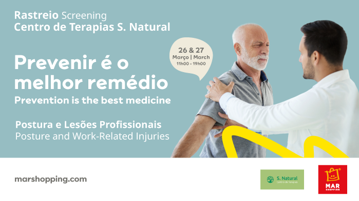 No MAR Shopping Algarve, o rastreio será desenvolvido pelo Centro de Terapias S. Natural e incidirá sobre a postura e lesões profissionais (como no túnel cárpico, no supraespinhoso, entre outras lesões). As dores nas costas surgem muitas vezes como consequência do trabalho diário que executamos e, de acordo com as estatísticas, atingem 70% da população ativa em Portugal, que tem de estar sentada em frente a uma secretária pelo menos 8 horas por dia, de forma continua e com posturas pouco corretas para a saúde da coluna. Este cenário foi agravado pela pandemia, porque agora o trabalho e as aulas são feitos em casa, onde temos menos recursos que num escritório para manter uma postura correta.