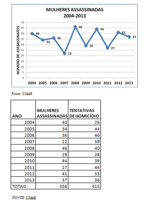 - “Sobre o que chamo «as estatísticas da morte» em Portugal, e que são as aproximações à realidade dos assassínios ou tentativas de assassínio de mulheres às mãos de parceiros ou ex-parceiros, que a UMAR há mais de uma década tão bem tem recolhido e divulgado, gostaria de chamar a atenção para a persistência do fenómeno na última década, mas com números que têm altos e baixos, mas não se têm afastado do desvio-padrão. Ou seja, por exemplo, no que respeita aos assassínios, não existe uma tendência crescente ou decrescente. Não há dois anos consecutivos a subir ou a descer no número de mortes. O fenómeno, inaceitável, continua, mas não é a crise económica que o amplifica. Em 2004 foram mortas 40 mulheres, em 2013, foram 37. Nesta década, o máximo foram 46 mortes (em 2008), e o mínimo foram 22 (em 2007). Veja-se o gráfico seguinte. É um sobe e desce constante. No primeiro semestre de 2014 já vamos com 24 mulheres assassinadas e 27 tentativas de homicídio. Provavelmente, o gráfico no final do ano registará nova subida. O iô-iô continua.”