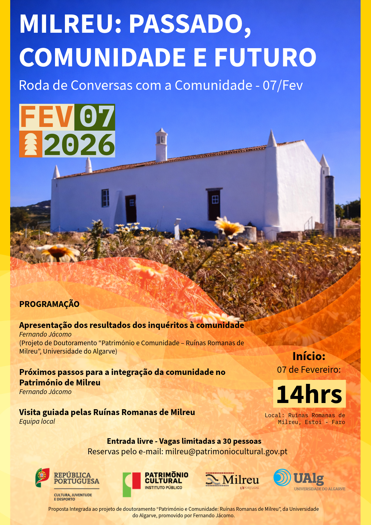 A equipa das Ruínas Romanas de Milreu e o investigador da Universidade do Algarve, Fernando Jácomo, têm o prazer de o convidar para participar na Roda de Conversas com a Comunidade de Estoi/Faro, subordinada ao tema “Milreu: Passado, Comunidade e Futuro”, que terá lugar no próximo dia 7 de fevereiro (sábado), pelas 14h00, na Casa Rural das Ruínas Romanas de Milreu.