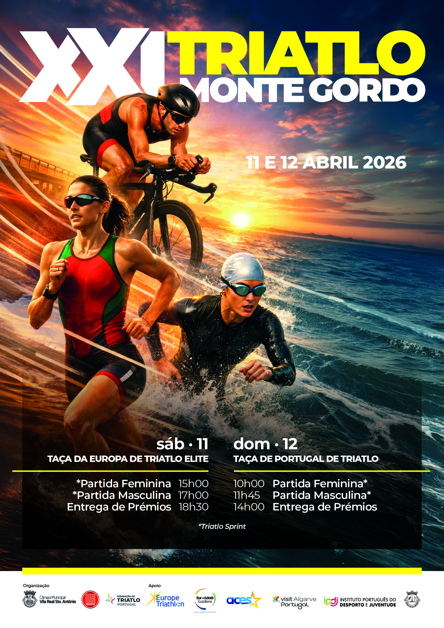 “O XXI Triatlo de Monte Gordo volta a afirmar-se como um dos grandes eventos desportivos do concelho, ganhando, este ano, uma dimensão ainda maior com a realização, em simultâneo, da Taça da Europa de Triatlo de Elites e da Taça de Portugal. Este posicionamento resulta do trabalho desenvolvido pela autarquia, nomeadamente através do Centro de Alto Rendimento de Vila Real de Santo António, fundamental para atrair atletas e competições internacionais”, afirma o presidente da Câmara Municipal de Vila Real de Santo António, Álvaro Araújo.