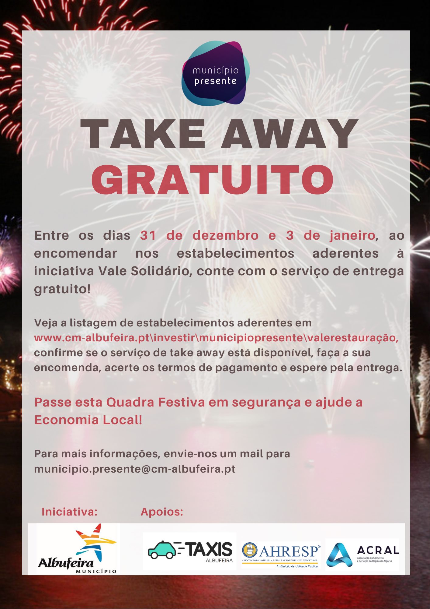 Entretanto, a partir de amanhã e até ao dia 3 de janeiro, o Município vai implementar uma nova medida de apoio ao setor da restauração, através do financiamento de serviços de Take away efetuados dentro do concelho. O serviço, que é totalmente gratuito, será prestado através da Albucoop, no âmbito da “Bolsa de Quilómetros”, recentemente protocolada com aquela associação. Assim, ao encomendar nos serviços aderentes do Vale Solidário/Vale Restauração, poderá aceder gratuitamente a serviços de Take Away. Consulte a lista em: https://www.cm-albufeira.pt/content/vale-restauracao.