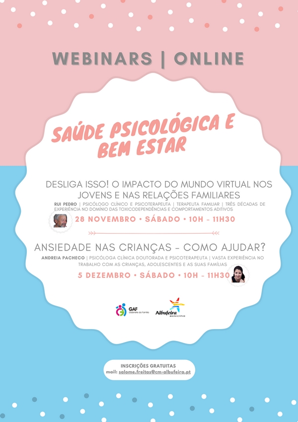 O primeiro Webinar, intitulado “Desliga Isso! O Impacto do Mundo Virtual nos Jovens e nas Relações Familiares” realiza-se a 28 de novembro e o segundo, dedicado ao tema “Ansiedade nas Crianças – Como Ajudar?” está agendado para o dia 5 de dezembro, ambos a ser transmitidos em direto, das 10h00 às 11h30, através da plataforma ZOOM. As inscrições são gratuitas. Basta enviar email para: salome.freitas@cm-albufeira.pt.