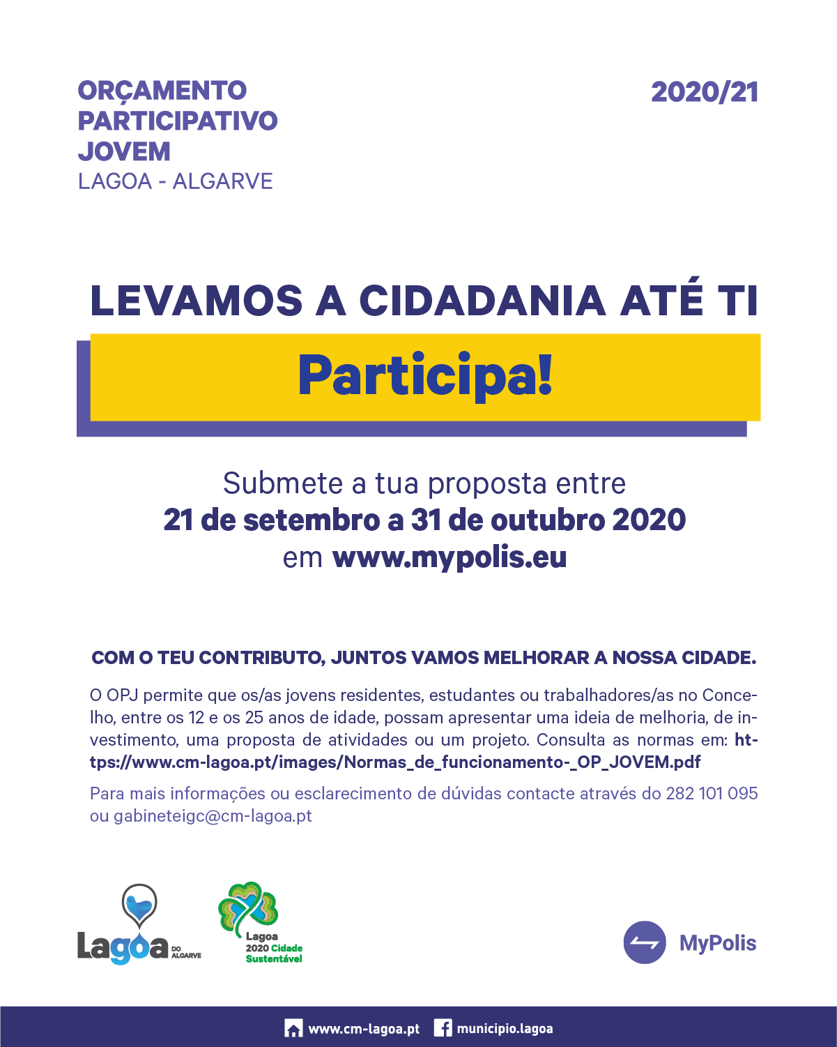 De referir ainda que, no âmbito participação ativa dos seus cidadãos/cidadãs nas escolhas do Município, a Câmara Municipal de Lagoa, em parceria com a Associação Discurso Paralelo, está também a implementar o projeto “MyPolis – Cidadania 4.0 em Lagoa”, resultante da aprovação da candidatura à iniciativa Portugal Inovação Social, uma iniciativa pública que visa promover a inovação social e dinamizar o mercado de investimento social em Portugal.
