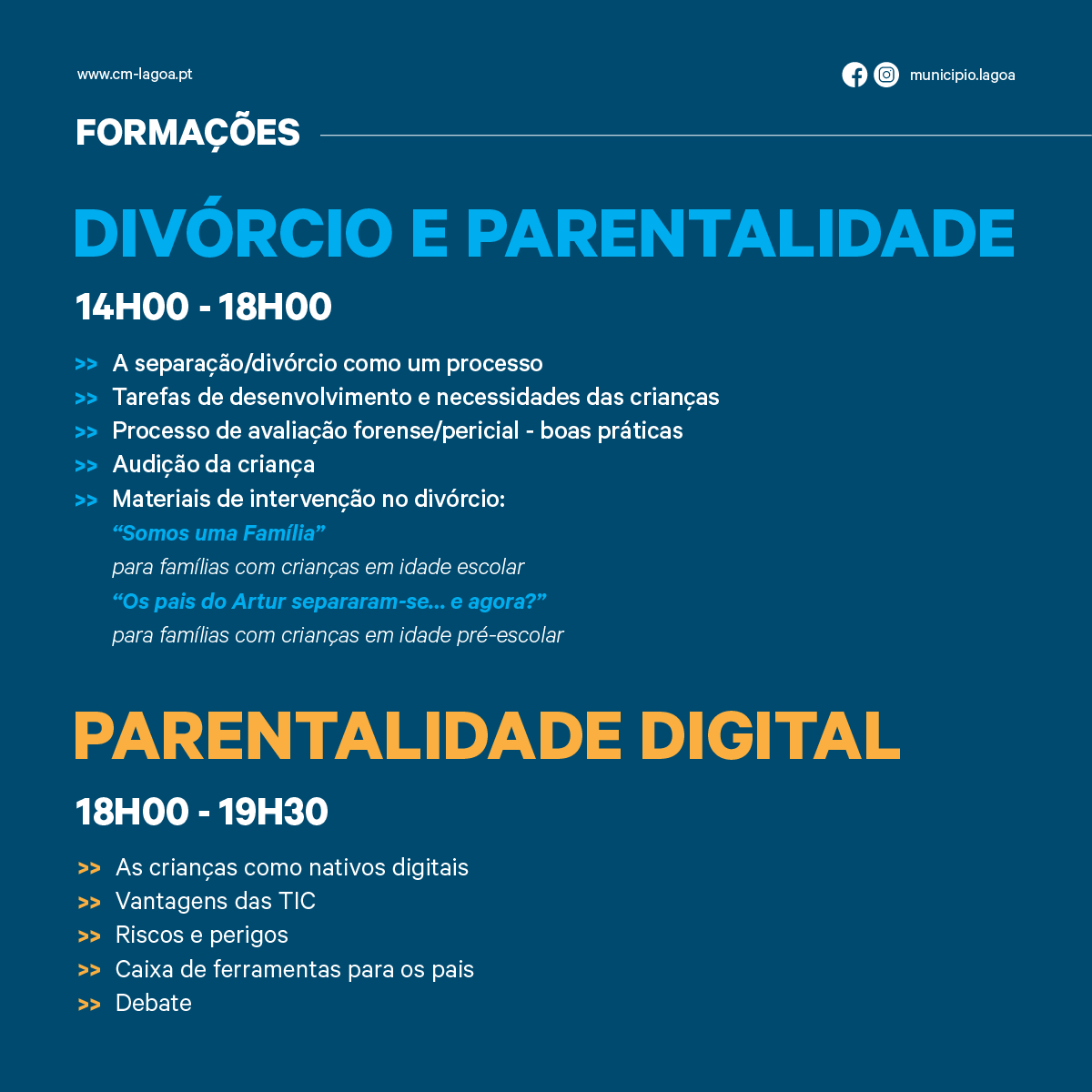 Com vista à prevenção de comportamentos de risco e à promoção de comportamentos saudáveis ao desenvolvimento equilibrado de crianças em idade escolar, irá dinamizar no mês de outubro duas formações: “Divórcio e Parentalidade” e “Parentalidade Digital” a realizarem-se na Sala Polivalente da Biblioteca Municipal de Lagoa, no dia 28 de janeiro.