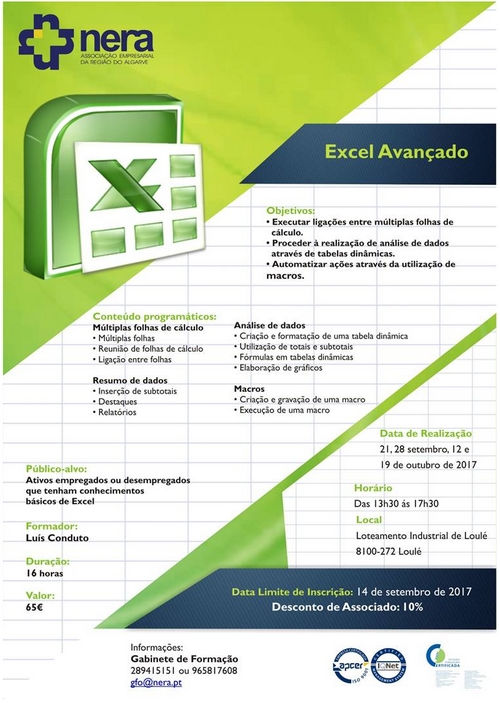 Com o objetivo de no final da ação de formação, os participantes deterem as seguintes competências ao nível da ferramenta de trabalho Excel: saber executar ligações entre múltiplas folhas de cálculo; proceder à realização de análise de dados através de tabelas dinâmicas e automatizar ações através da utilização de macros, o NERA irá realizar, nas suas instalações, nos dias 21, 28 de setembro, 12 e 19 de outubro de 2017 a ação de formação: Excel Avançado.