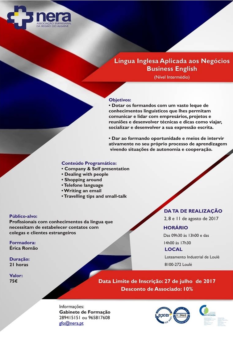 Com o objetivo de dotar os formandos com uma vasto leque de conhecimentos linguísticos que lhes permitam comunicar e lidar com empresários, projetos e reuniões e desenvolver a sua expressão escrita e ainda dar ao formando oportunidade e meios de intervir ativamente no seu próprio processo de aprendizagem vivendo situações de autonomia e cooperação, o NERA irá realizar, nas suas instalações, nos dias 2, 8 e 11 de agosto de 2017, entre as 09h30 e as 17h30, a ação de formação: Língua Inglesa Aplicada aos Negócios.