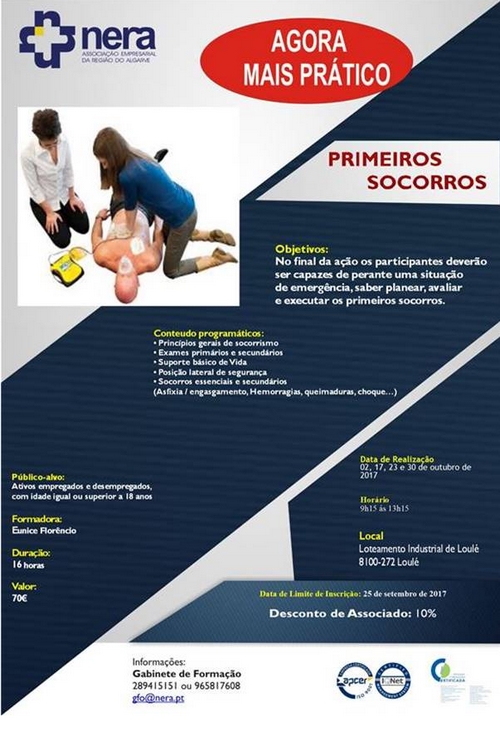 Com o objetivo de no final da ação de formação, os participantes serem capazes de perante uma situação de emergência, saberem planear, avaliar e executar os primeiros socorros, o NERA irá realizar, nas suas instalações, nos dias 02, 17, 23 e 30 de outubro de 2017 a ação de formação: Primeiros Socorros.