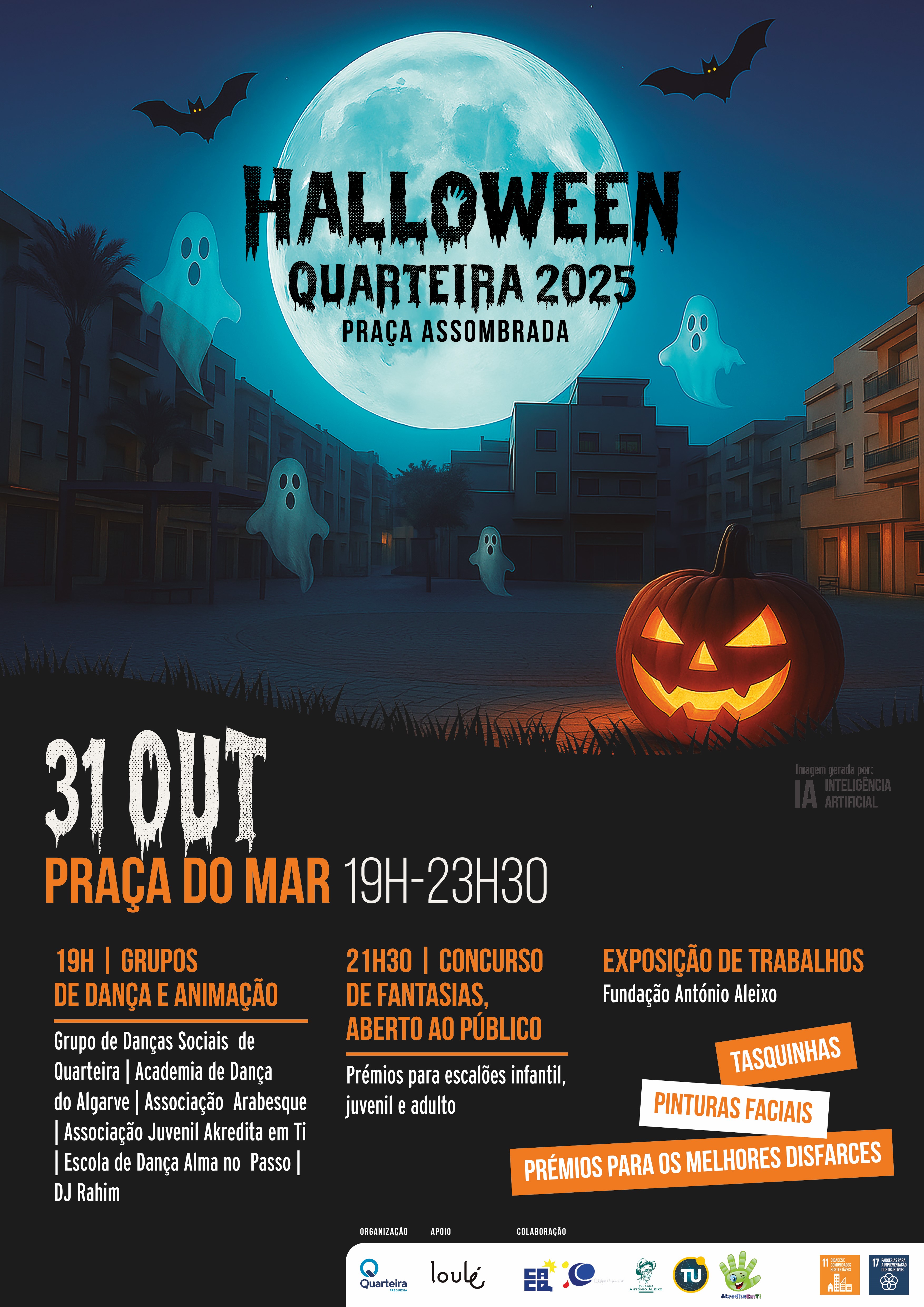 A festa do Halloween é um evento de entrada livre organizado pela Junta de Freguesia de Quarteira, com o apoio da Câmara Municipal de Loulé, e em colaboração com o Centro de Apoio à Criança de Quarteira, o Colégio Origami, a Fundação António Aleixo e a Associação Talentos Unidos.