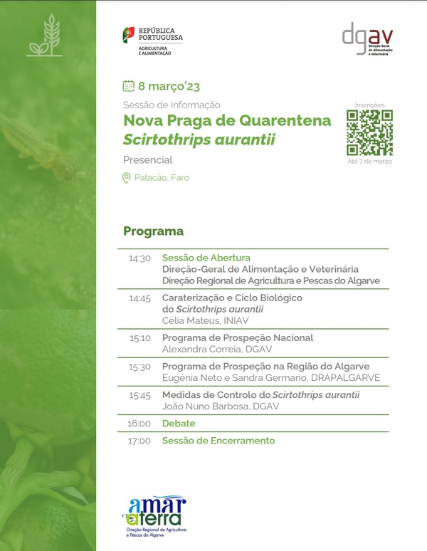 Sessão de Informação sobre a Nova Praga de Quarentena Scirtothrips aurantii , agendada para o dia 8 de março, nas instalações da DRAP Algarve (Patacão), entre as 14h30 e as 17h00, através de sessão presencial numa parceria entre a DGAV e a DRAPALGARVE.