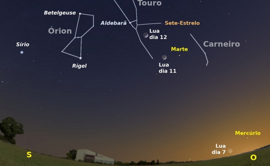 Ao início da noite de dia 7 a Lua cruzar-se-á com Mercúrio. Mas por estarem numa direção muito próxima da do Sol serão ofuscados por ele. Aliás, Mercúrio só voltará a ser visível na última semana do mês, já como estrela da manhã.
