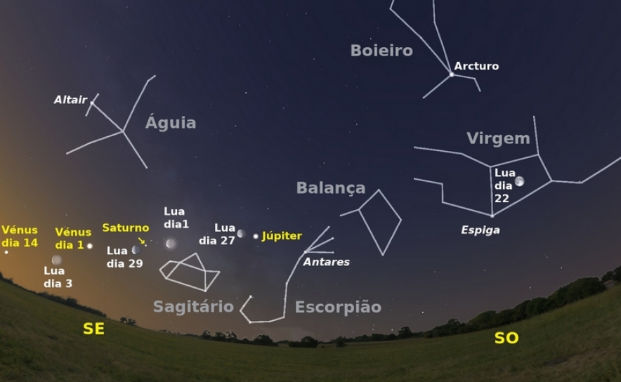 Figura 1: céu a sul ao final da madrugada de dia 1. Igualmente é visível a posição de Vénus na madrugada de dia 14 e da Lua nos dias 3, 22 27 e 29.