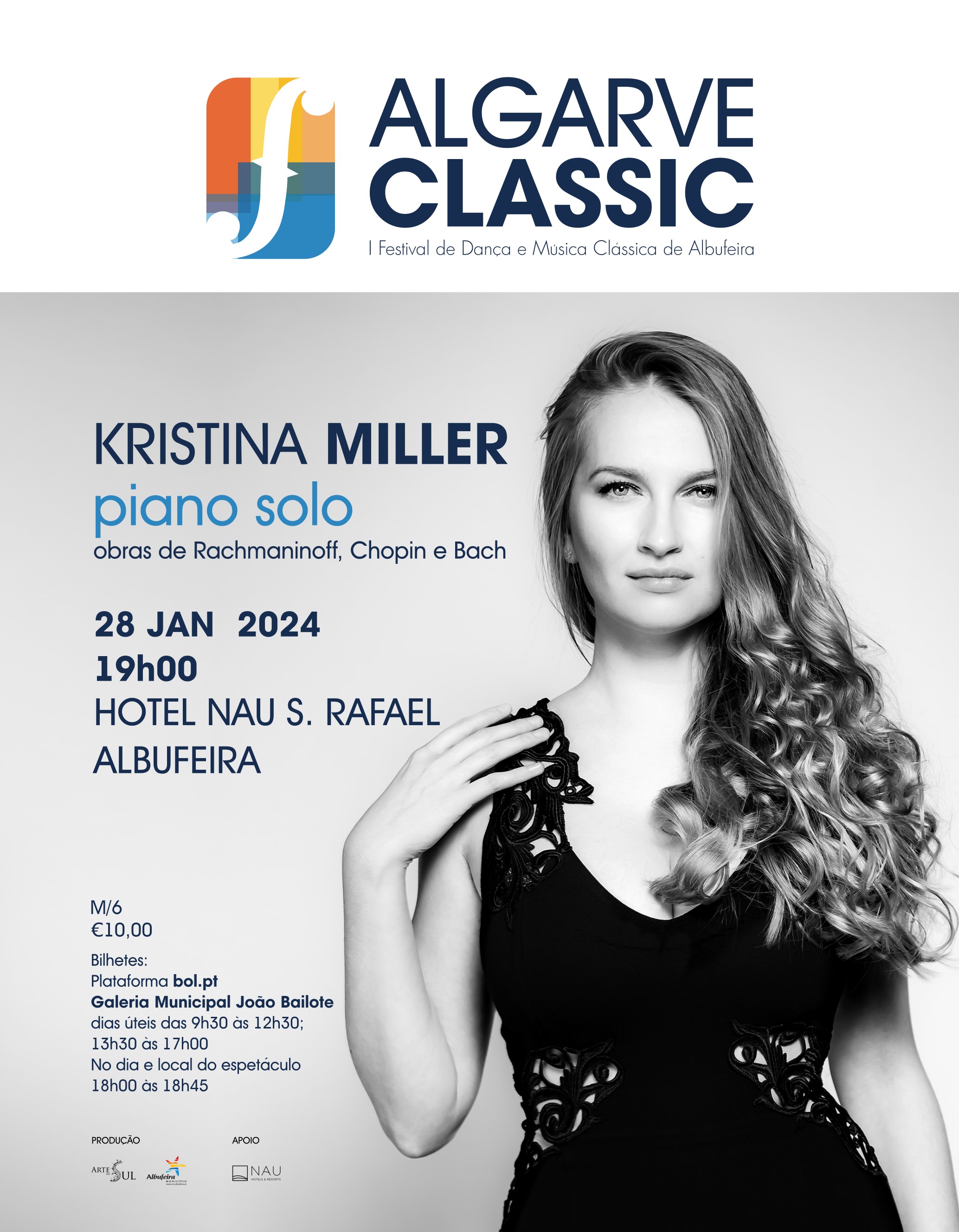 No dia seguinte, a 28 de janeiro, Kristina Miller sobe ao palco do Hotel Nau S. Rafael, às 19h00. Integrado no programa do “Algarve Classic – I Festival de Dança e Música Clássica de Albufeira” estrutura apoiada pelo Município de Albufeira e pela Associação Artedosul. A artista russa/alemã, que desde os 12 anos de idade atua em diversos palcos internacionais, traz até Albufeira um solo de piano com obras de Rachmaninoff, Chopin e Bach, num momento de diversidade musical, complexidade e de exuberância técnica e interpretativa.