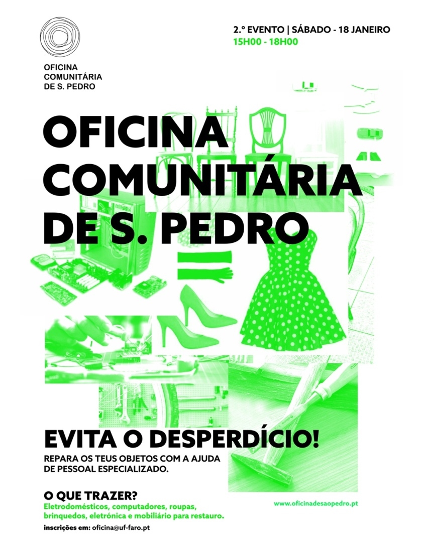 A iniciativa tem lugar na delegação de S. Pedro (Av. da República, n.º 196). As inscrições são gratuitas e podem ser efetuadas na página eletrónica www.oficinadesaopedro.pt ou através do e-mail oficina@uf-faro.pt com indicação do nome do participante e descrição do objeto a reparar.