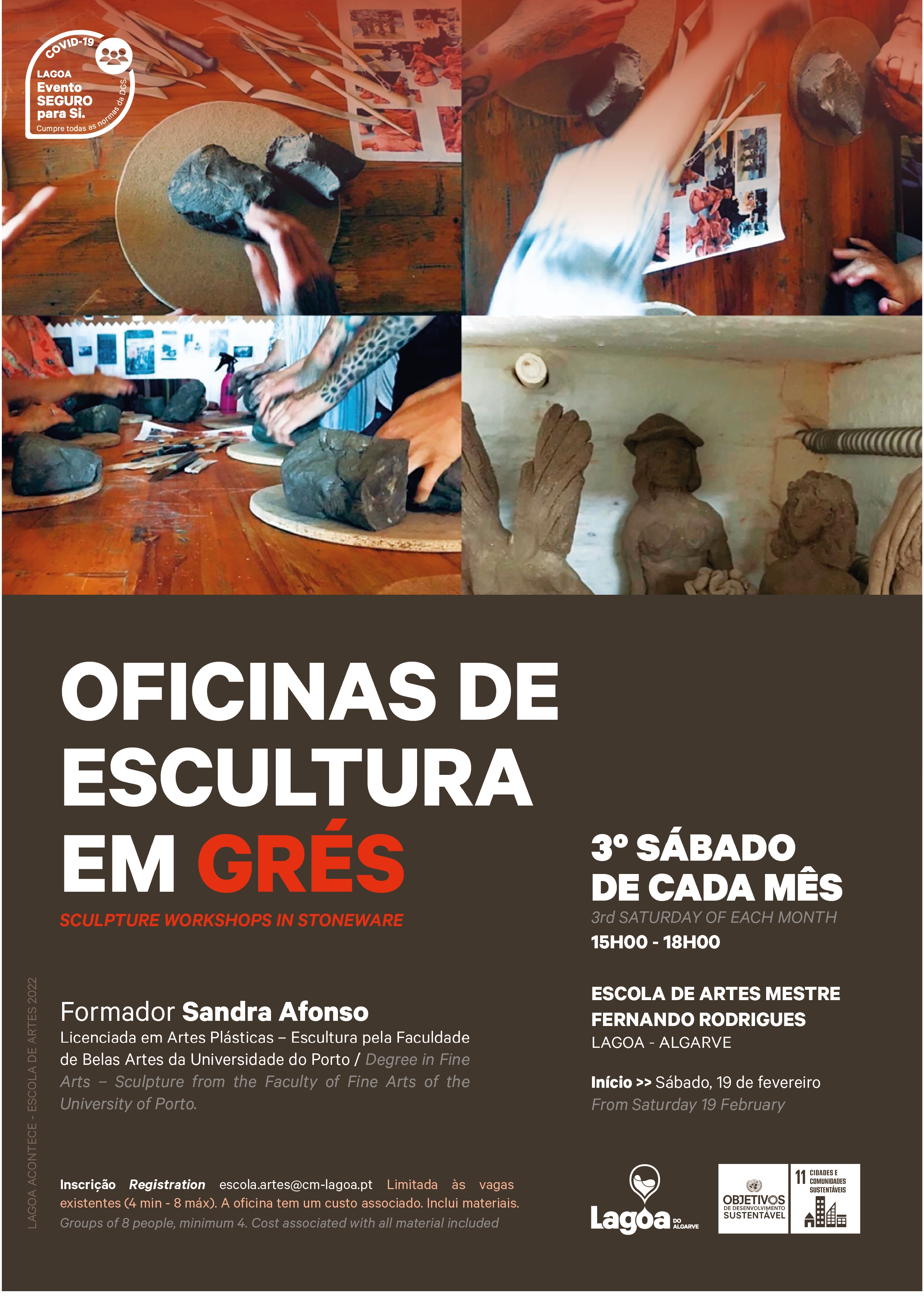 A participação nas Oficinas de Escultura em Grés tem um custo associado (inclui os materiais) e está sujeita a inscrição prévia para o email escola.artes@lagoa.pt sendo limitada às vagas existentes: mínimo 4 pessoas e máximo 8.