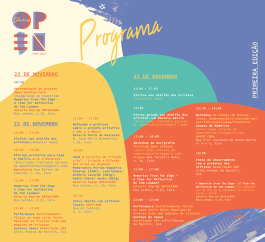 Para além dos estúdios abertos, teremos outras atividades a decorrer - Sábado às 18h uma conversa moderada pela Prof. Dr. Miriam Tavares : O Circuito da criação a Sul - Criação e Difusão das Artes no Algarve; uma performance, a decorrer em permanência na 289, de Gustavo Jesus: Infinitamente finito ou como teria feito Penélope se tivesse tido uma máquina de tricotar; reflexão e práticas sobre o projeto artístico O Véu e a Moura, na Galeria Porta do Nascente; e 3 Workshops pensados para vários públicos: Workshop de Serigrafia, Printing Open Studios; Oficina Artística para toda a Família, Arte e Natureza; Um espaço de Ensiao. Corpo: membrana/ pele/casa/ abrigo/ território/ paisagem/ fronteira.