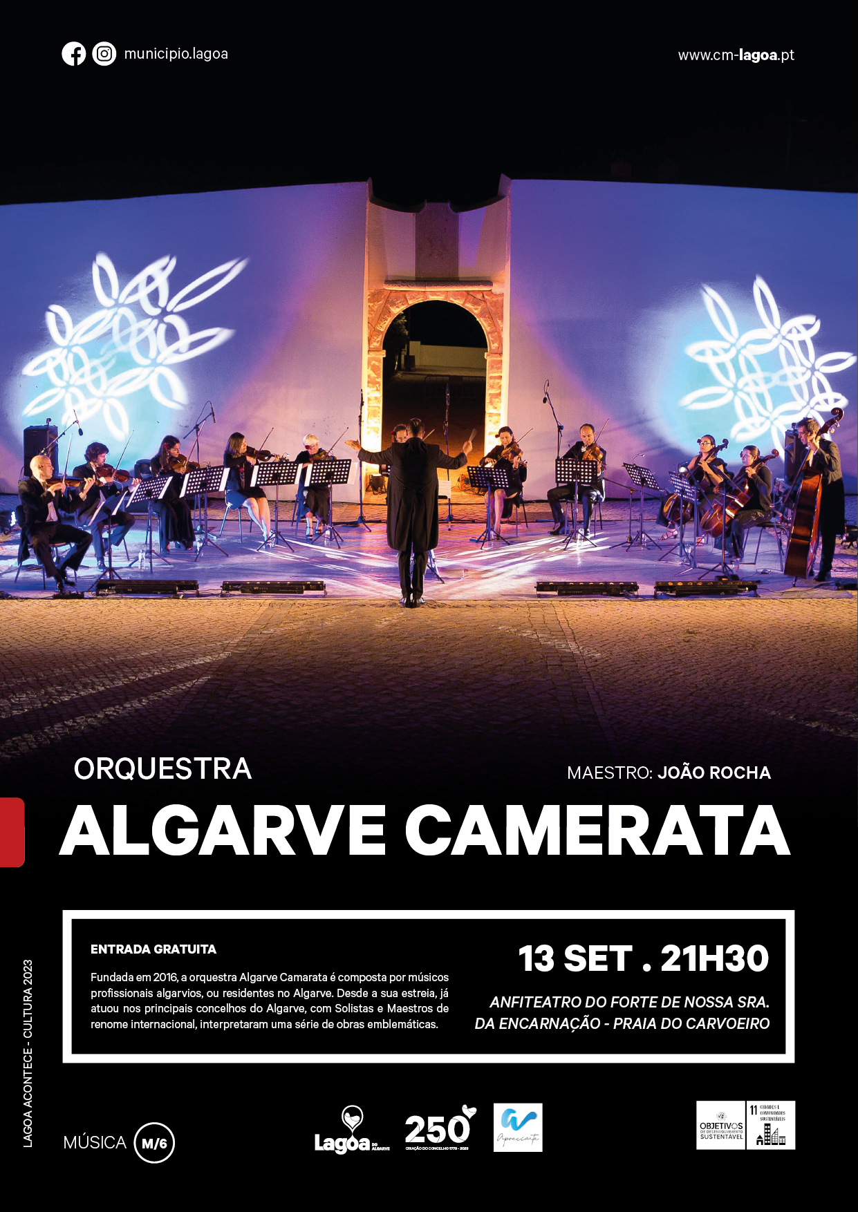 O Anfiteatro do Forte de Nossa Sra. da Encarnação, na Praia do Carvoeiro, em Lagoa, será palco do concerto da “Orquestra Algarve Camara”, dirigida pelo Maestro João Rocha, no dia 13 de setembro, pelas 21h30.