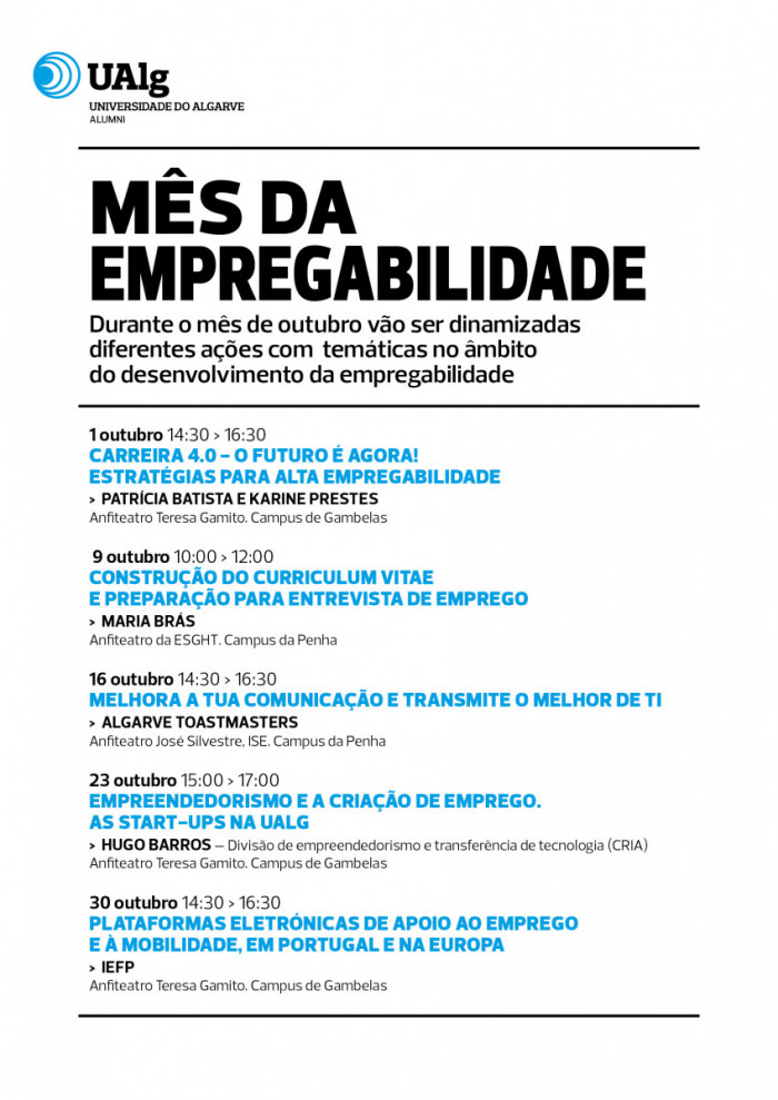 A 2ª edição do «Mês da Empregabilidade» contará, assim, com diferentes oradores convidados que abordarão temáticas como: «Carreira 4.0 - O futuro é agora! Estratégias para alta empregabilidade», «Construção do Curriculum Vitae e preparação para entrevista de emprego», «Melhora a tua comunicação e transmite o melhor de ti», «Empreendedorismo e a criação de emprego. As start-up na UAlg» e «Plataformas eletrónicas de apoio ao emprego e à mobilidade, em Portugal e na Europa».