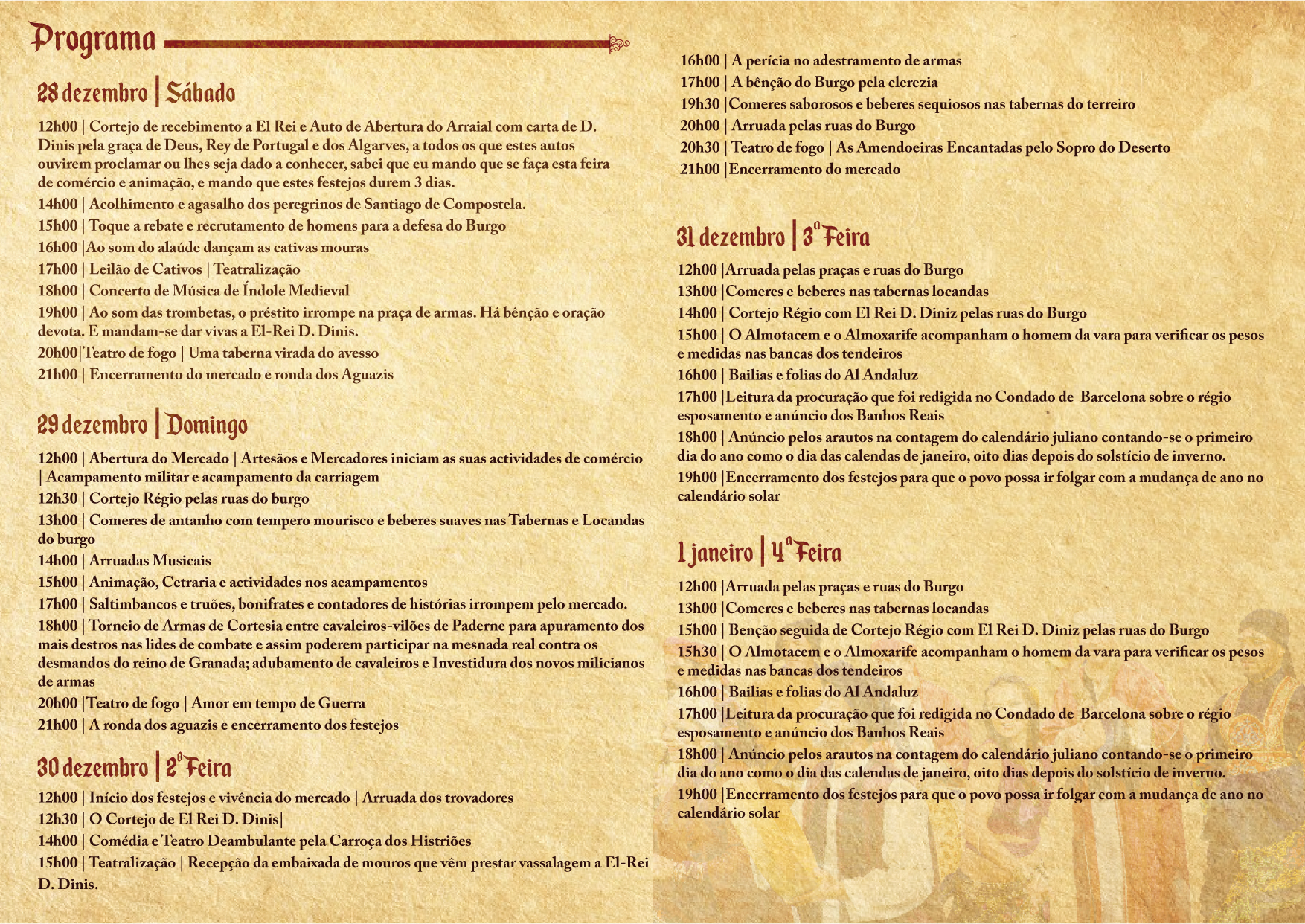 Este ano, o evento estende-se por mais um dia, com um programa recheado de atividades. A abertura está marcada para as 12h00 de sábado, quando El Rei de Portugal e dos Algarves proclamará a abertura da feira de comércio e animação e mandará que os festejos durem cinco dias.