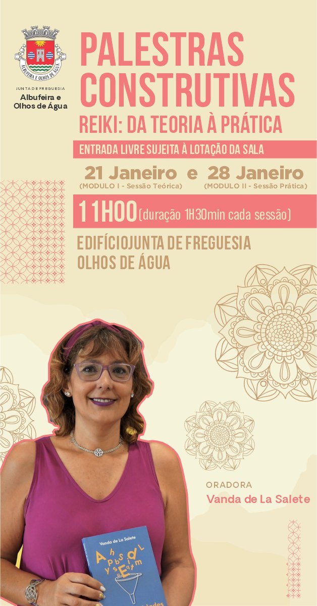 O edifício de Olhos de Água da Junta de Freguesia de Albufeira e Olhos de Água vai receber, nos próximos dias 21 e 28 de de janeiro, a iniciativa “Reiki: Da Teoria à Prática”, dividida em duas sessões dinamizadas pela professora Vanda de La Salete.