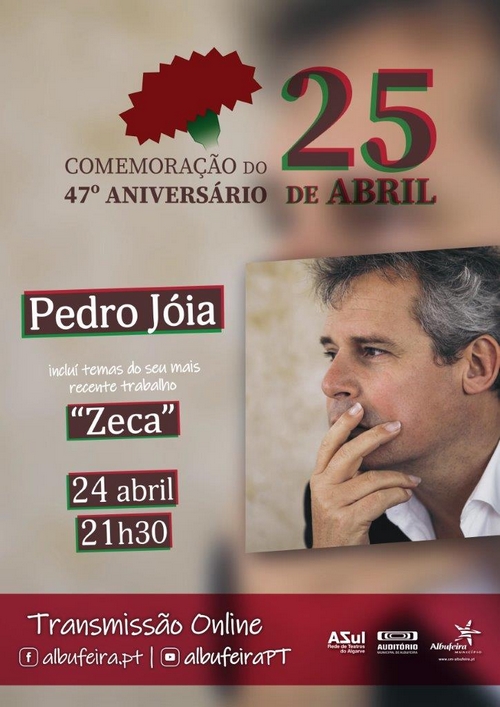 No dia 24 de abril, a partir das 21h30, o Município de Albufeira retoma o ciclo de concertos online com o espetáculo comemorativo do 47º Aniversário do 25 de Abril no concelho. Sente-se confortavelmente no seu sofá e aceda ao canal YouTube ou ao Facebook da autarquia para assistir ao concerto de Pedro Jóia “Zeca Afonso”, que inclui temas do seu mais recente trabalho.