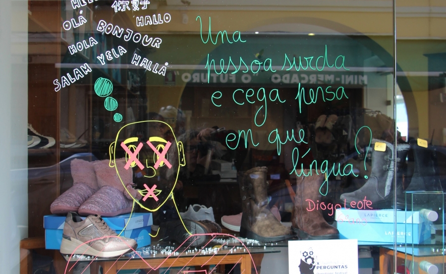 “Que pergunta farias ao passado?”) e desenhá-las nas montras de uma das ruas comerciais da cidade de Loulé.