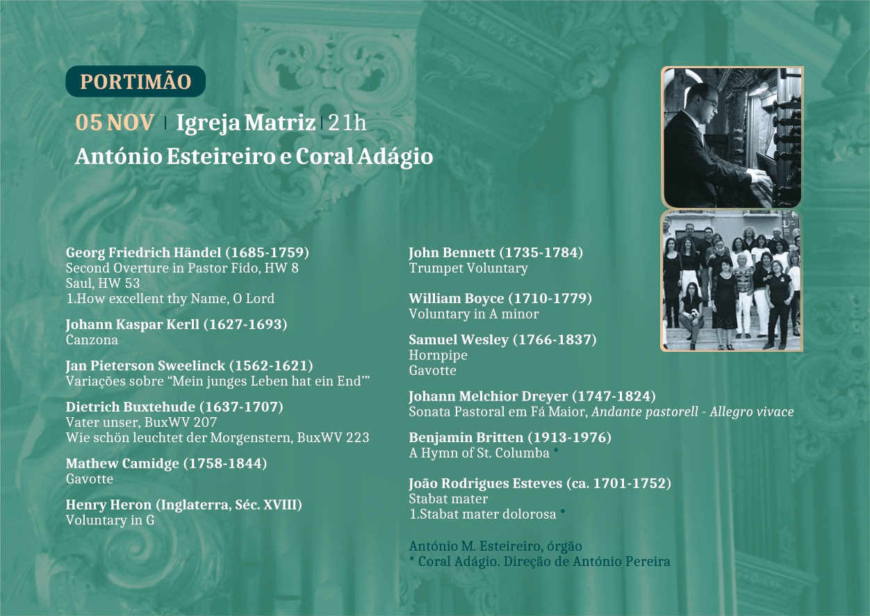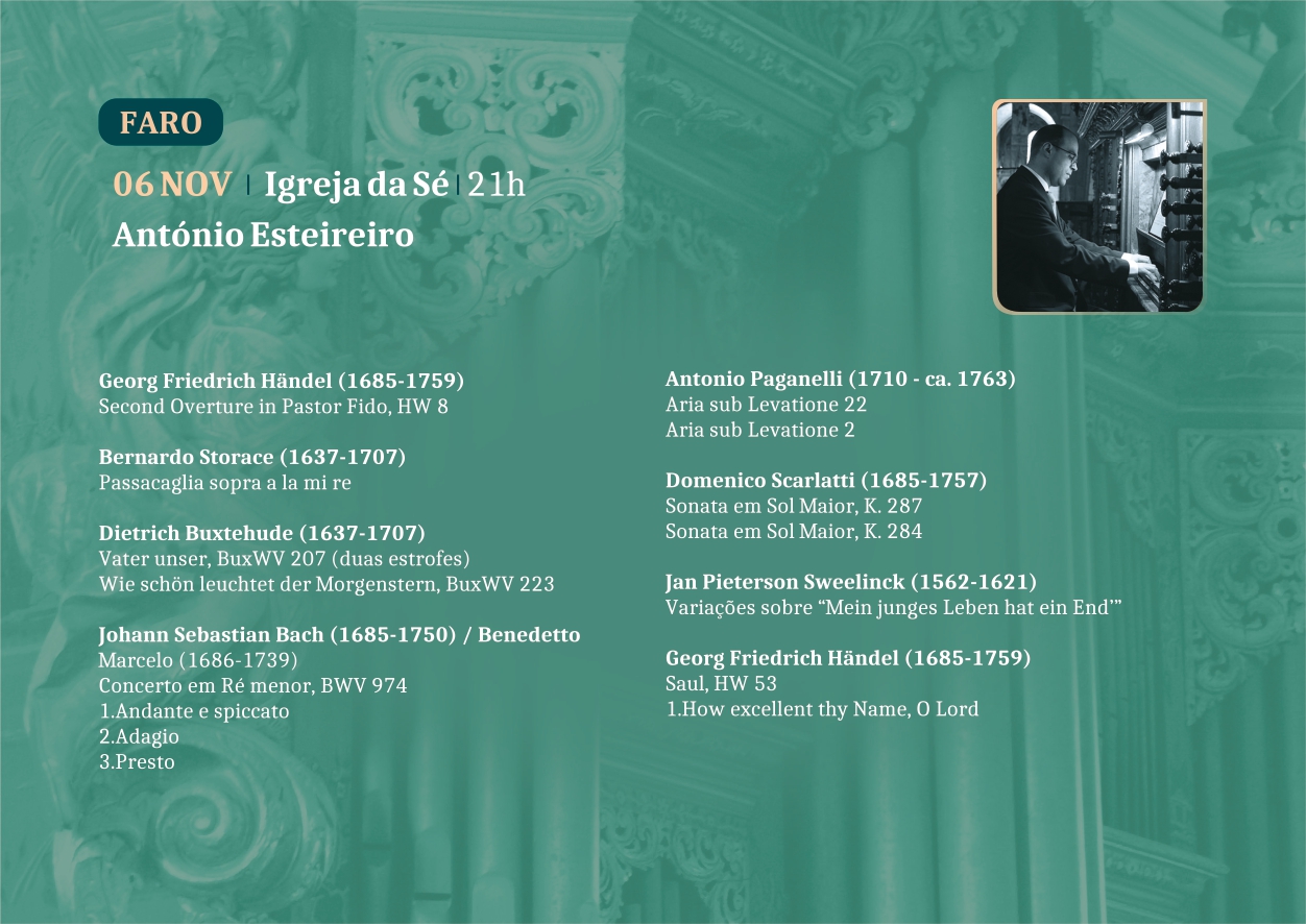No dia seguinte, 6 de novembro, António Esteireiro altera o repertório e apresenta-se a solo no órgão da Sé de Faro. Percorrendo o caminho construtivo e as influências que marcam este instrumento único de 306 anos, o programa de concerto recai sobre compositores alemães, italianos e holandês dos séculos XVI a XVIII. Escutaremos aberturas, passacaglias, corais, concertos, árias e sonatas, de Handel, Storace, Buxtehude, Bach, Paganelli, Scarlatti e Sweelinck.